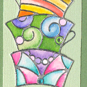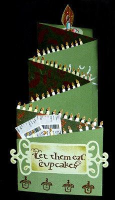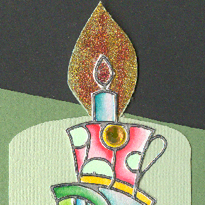 Place Peel offs (ECraftDesigns Cakes Silver #2478) onto watercolor paper, cutting and stacking them to get the height you want. I used 3 different cake piles from the sheet. Then color with Tombows, lightly moisten the paper, so when you add the color it will start to bleed and is easier to continue moving the color to get nice blends. Do the same with the gel pens. Note, the gel pens when dry can not be moved again, they are permanent. Cut out around images and adhere to the minty green cardstock. Cut this in the shape of a candle including a flame, and adhere to last page of main card. Add some Quickie glue to the flame and add glitter. Embellish with some faux rhinestones. |
