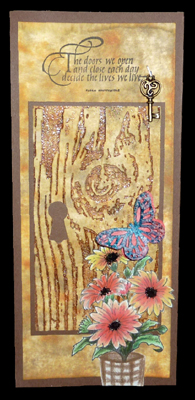 I started with a medium toned brown cardstock for the main card and folded it at the 4" and 8" mark. The front of the card opens from left to right. I seem to like doing that lately. The decorative background is cream toned cardstock, sponged direct to paper with Distress Scattered Straw, Wild Honey, Frayed Burlap & then blended with Old Paper. Misted with water and dried. The wood grain uses a piece of the decorative background. The embossing folder (Sizzix WoodGrain set #65664) was spread with a coat of Distress Vintage Photo, then the decorative background put in and run through the embossing machine, then clear embossed. Trimmed down to size, keyhole die (Sizzix Tim's keyhole #656630) cut out, then layered to the brown cardstock, which was then layered onto the decorative background and on to the main card. Stamped the quote with Versafine Black Onyx. Attached the key charm with Tim's tiny attacher.