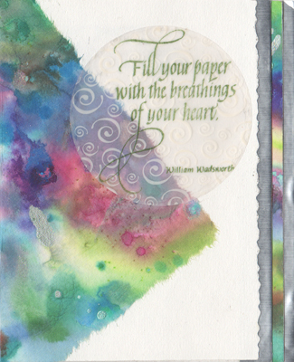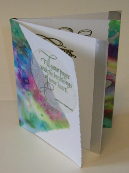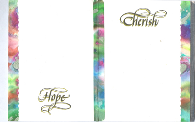 Created: May 17, 2009 I sprayed the background onto a piece of thick rice paper using various colors of water medias (Adirondack color wash sprays, Bombay acrylic Inks, Pearlescent ink). I used my sewing machine to put two off set pieces of white cardstock together to crate the booklet. I covered the spine edges with the overlap of the background paper, which I also used to trim one of the edges of the pages. The other two edges are covered with faux aluminum shelf liner. |