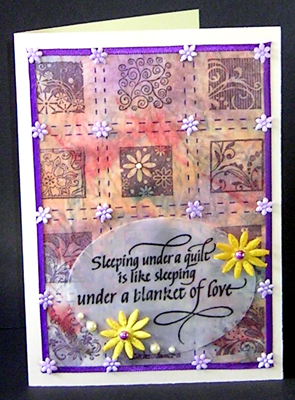 Created: November 14, 2009 I used a piece of white cotton ironed flat, and randomly marked it with Distress stamp pads in various shades of yellows, reds, purples, blues, misted to blend and merge colors scrunching up the fabric to get lots of creases, and continued applying stamp colors till pleased with the results. After the last scrunching, I skimmed a dark purple over the high points accentuating the crease marks. Ironed flat and until dry. Rubber stamped various inchy stamps from Inkadinkado "Flourishes #98772" & "Flower Garden #98770" with Versafine Imperial Purple. Made faux stitching lines with a Zig purple marker. Adhered the fabric to a cream toned main card with double sided tape. Adhered a thin purple silk ribbon with white glue, mitring the corners. Rubber stamped the quote (Quietfire Design) onto a piece of clear vellum with versafine Black Onyx, clear embossing it, then die cut with Spellbinders Classic Ovals large #s4-110 using the largest oval. Adhered to card with a thin bead of Diamond Glaze along the edge of the oval. Added bright yellow fabric flowers and some half pearls. For the last touch, I snipped lavender colored fabric flowers from a by the yard ribbon and adhered them to the cross sections of the faux stitching and along the edges. |