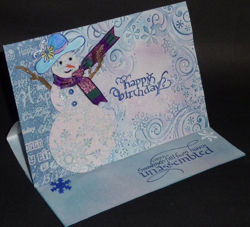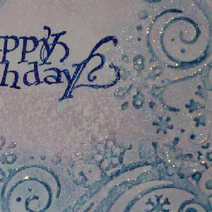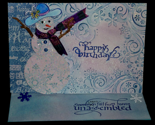 thoroughly. Placed it completely in my embossing folder (Cuttlebug Winter Wonderland set #200220) and having about a 1.5" piece sticking out of the folder. Ran through my machine, hit the high point with Faded Jeans using my sponging tool and a very light pressure. Embossed with Holographic embossing powder. Placed my cardstock back in the folder to emboss the other 2 edges, creating a 5 x 5 embossed square design. Hitting the high points of the new embossing and embossing with the Holographic. Sponged a bit more of the Broken China and the Spun Sugar here and there. Stamped my sentiment with Versafine Majestic Blue Masked the edge of my embossed square with post it notes and worked on the 1.5" section. Stamped the Happy Birthday background stamp (Local King Rubber) with Perfect Medium and clear embossing, then sponged Distress Blue Jeans very heavily. Repeatedly stamped the snowflake (Inkadinkado "Artistic Holiday") using the Majestic Blue on white cardstock to cover an area large enough to die cut 3 circles (Spellbinders Standard Circles Large die set) for my snowlady. Placed some Starform Transparent Glitter adhesive sticker onto the stamped area then die cut it using the 1st, 2nd & 4th die. Adhered the 3 balls with some Glossy accents. Sponged some Distress browns onto a scrap piece of white cardstock and die cut the Sizzix Branch Tree, cutting off a couple branches for the arms. Used alcohol based markers to do the nose, eyes and mouth. Stamped the hat (See Dee's "Hats off to You") on white cardstock and clear embossed, then used watercolors to paint it in. Cut it out and adhered it to my snowlady. Added a piece of ribbon and some blue half pearl buttons. Adhered to my background with pop dots. I top folded to make a 5"h x 7"w card. Then I scored and folded the top piece in half. Adhered my background piece matching the bottom edge of the last fold I made. Sponged the floor of the card with Broken China, misted with perfect Pearls "Perfect Pearls". Stamped my quote with the Majestic Blue, crossed out the word men" and wrote in "lady". Added two snowflake brads (Hero Arts "Little Snowflakes") as stoppers. |