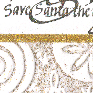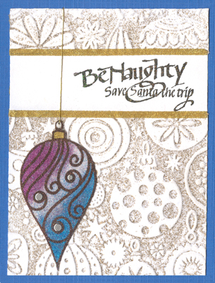 I cut the design and adhered it to my main dark blue Textura card and put another white strip between them for my "Be Naughty" sentiment (Quietfire Design) stamped with Versafine Black Onyx and embossed with Stampendous Kaleidoscope. Added two thin strips of double sided Sookwang tape and Glitter Ritz Micro fine glitter "Dark Gold". |
