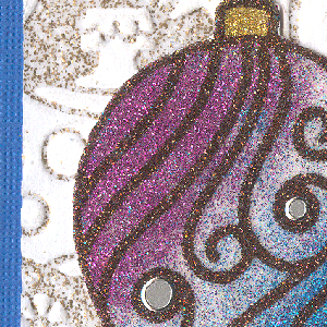 The ornament is a peel off design by Elizabeth Craft Designs. I put a piece of double sided tape onto a white cardstock, put another piece of tape under the cardstock. Removed the top release paper and placed my peel off onto the tape (both negative and positive using Peel Offs Magic Tape). I cut around my design, then started removing the peel off for the outline image filling the spaces with Bronze. I cleaned my ornament really well, making sure I didn't have any loose glitter. Removed the rest of the release paper and sprinkled some Rose, Royal Blue and Cool Highlights in the center, then merged and blended the colors and burnished well. Removed the back layer of release paper and adhered it to my card. Added a gold thread hanger. |