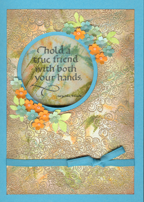 Created: September 6, 2009 I used a bamboo skewer, rolled in Distress stamp pads (Peeled Paint, Mustard Seed, Spiced Marmalade, Broken China) and then rolled onto Arches text wove paper. See detail pic below. Misted the paper with water, lay a piece of paper towel on top to soak up excess moisture. Repeated the procedure on the damp paper. Rolled the bamboo skewer again with the Peeled paint and the Broken China, but did not mist this time, wanted to give some definition to the strokes. Trimmed the paper down to size and cut out my circle with the Orbis circle scissor. Rubber stamped the quote (Quietfire Design) onto the dropped out circle with Versafine Black Onyx. Set this aside and continued with the decorated paper. Using the sponging tool around all the edges with Frayed Burlap and Aged Mahogany. Rubber stamped the swirl stamp (#549A from Old Island Rubber Stamps) randomly, keeping some open areas for interest, and used Color Box Petal Points Peacock Gold and Queen's Gold embossing powder. Tied a bow in the blue stain ribbon and adhered it with double sided tape, trying to keep the satin on top and adhered the ends to the back of the paper.. |