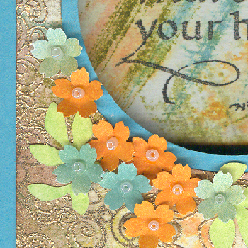 Placed the decorated paper onto my folded card, keeping the borders even, and lightly penciling a few points for the circle. Removed the decorated paper and realigned my Orbis scissors and cut out the smaller circle. Adhered my decorated paper to the card front and the dropped out circle to the inside of the card. Colored some white copy paper using the Spiced Marmalade and the Broken China, then with my Carl mini Sakura punch, punched out about 18 flowers and placed them pleasingly around the circle. When I was happy, glued them down with some white glue. Added a couple leaves that I cut with my Cricut. (Didn't have the right leaves in a punch BIG GRIN). Glued a "Snow White" glass bead in the center of each flower with more white glue. |