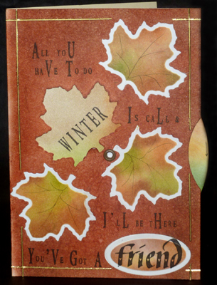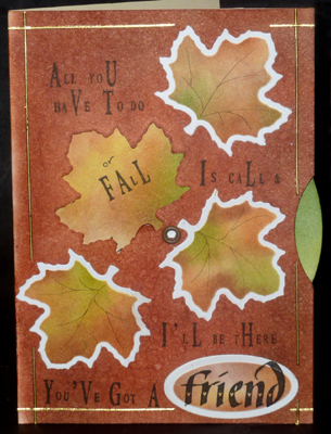 Cut a circle with an EK Success Orbis circle scissor at #125 (approx 5" diameter) from white cardstock. Divided the circle into 4 sections with a light pencil mark to indicate where the season would fall. Then sponged the appropriate colors in that area (winter in light browns, spring in light greens, summer in vibrant greens & fall in yellows and oranges). Marked the center of the circle, punched a hole that would fit my eyelet. Placed the circle on my card face to determine where it needed to be placed so the cut out maple leaf would always have a backing. Marked the center point and punched a hole there as well. Used a large circle punch to punch a scallop into the edge of my card to turn the wheel more easily. Attached the eyelet to the circle and card face. Adhered my maple leaves, then started stamping the quote using Just Rite Times Roman font in the smallest and medium size. Placed the words "Winter", "Spring", "Summer", "or Fall" in the appropriate spaces in the leaf wheel, then added the words "All you have to do is call & I'll be there. You've got a" on the card itself.. The word "FRIEND" ("Friendship" Quote Marks set by Quietfire Design) was stamped with black, clear embossed on a separate piece of white cardstock, cut with an oval Spellbinders die, dry embossed, sponged and adhered to the card. Adhered all this to a cream toned main card, then added the gold Peel Off lines. |