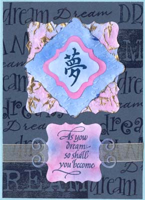 23, 2009 Wednesday Stamper has a challenge for this week in July to use DREAM in your artwork. Well Dream is one of my favorite words... I have 2 new punches from McGill, a 1.5" and a 1.75" Fancy Square Stacking Series. The 2 center ones (pink and pale blue where the Oriental character for Dream is) are the actual size of the punches. The 2 behind them are done with the same punch, but the paper was folded to get a larger square or rectangle. So with the 1.75" punch I can get a square a little bigger than 3.25" square and of course anything smaller than that to the size of the original punch. But then you say - I don't like the fold lines... Well you can spritz your paper with a bit of water and iron it flat. Or you can scrunch it up several times to get a lot of wrinkles and then decorate it. I did both options decorated the larger one using a Perfect Medium stamp pad on the high points of the wrinkles and gold embossing it. On the next square I ironed it and ran it through my Cuttlebug with the Script embossing folder. All the squares were colored with Pan pastels in combinations of Ultramarine Blue & Magenta. Rubber stamped the Asian character with Versafine Majestic Blue and embossed with Sapphire embossing powder. The quote (from Quietfire Design), was stamped with the same stamp pad. |