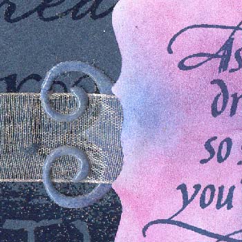 Reliquary, & various alphabet stamp sets) Used a Cuttlebug "Ornamental" die #37-1509 and some cardstock to punch out the negative portion of the top section of the heart shaped design, colored with the Pan Pastels and clear embossed it. Threaded my see thru ribbon through it and around the dark blue card. Mounted all this to the light blue main card.