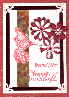 4, 2009 Wednesday Stamper has a challenge for July to use the colors in your flag. Well I live in Canada so my colors are red & white. I just bought these new stamps from Inkadinkado, and they're another beautiful set "Mindscapes #99121". Every time you look at them you see something else in them. No wonder they're called mindscapes. Anyway I rubber stamped it with Versafine "Satin Red" and clear embossed it on white cardstock. I then drew my strip and used Mona Lisa size and red variegated leaf. Rubber stamped the sentiment words Happy Birthday and the French version (both from Quietfire Design), I was raised in Quebec... Mounted this to a shiny metallic red cardsock then onto a white line cardstock (you can't see the texture in the pic, sorry), then onto a gold embossed red paper which I have put onto a white 110# cardstock main card, edge to edge. |