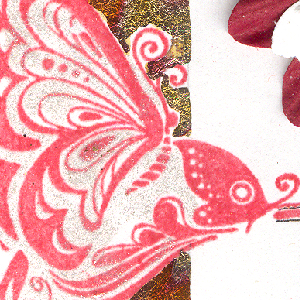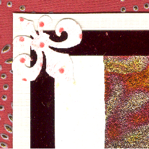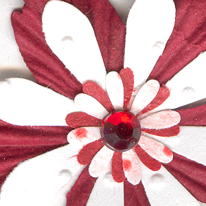 Punched out the Fleurs and adhered them to the corners. On the hummingbird I added Iridescent medium to give it some shimmer like a real hummingbird. Created the flowers using Prima "Essential 4" red florets, and adding some punched out ones using daisy type punches from the Swiss Dot paper both plain with the red from above, and from some red mulberry type paper, then added a red rhinestone. |
