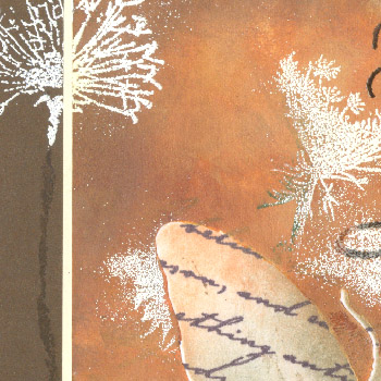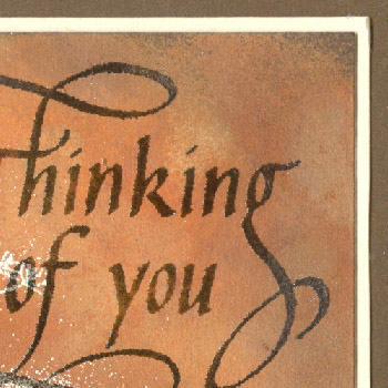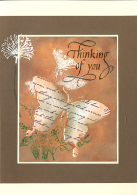 I started with a piece of white 110# cardstock and rubber stamped the script with Versafine Imperial Purple (it extended past my butterfly but the rest was covered up with the paint). Used an Evolving Images stencil/mask for the butterfly. Used the stencil portion first and with some Distress stamp pads and a sponging tool applied some Marigold and Broken China just to give it a bit of color. Only have 3 paint daubers so had to make do with acrylic paint instead. I used Ceramcoat (my favorite and I think best quality of acrylic craft paints), Maple Sugar, Mexicana & Bittersweet. Used the mask portion and applied dots of colors in the lower portion and with a "Cut & Stamp" foam piece, pounced my colors around, blending and merging the colors, applying more color where needed. When everything was dry, rubber stamped the Queen Anne's lace with leaves sprig and embossed part of it with white embossing powder. Trimmed the cardstock for neatness and with a sponging tool & Walnut Stain Distress pad darkened around the edges. Removed my butterfly mask. Placed my artwork onto the dark brown cardstock and rubber stamped the Queen Anne's Lace sprig embossing with white again. (I did this before adhering my artwork to the cream cardstock so my edges wouldn't be so thick). After stamping, I adhered the artwork to the cream cardstock, and trimming it to a slivered border, then adhered it to the dark brown matching the previous stamped image. Rubber stamped the "Thinking of You" (Quietfire Design) with Versafine Vintage Sepia and clear embossing it. Adhered all this to a cream toned card. |