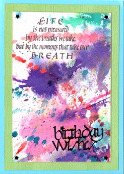 This one was mounted to a Bling green and then onto an aqua blue. I added black Peel Off stars in the corners. Rubber stamped the quote (Quietfire Design "Life is not measured") with black Versafine stamp pad. The "Birthday Wishes" are one of my calligraphic Peel Off sentiments (see link at the bottom of page).