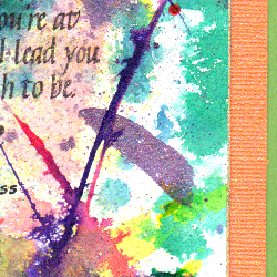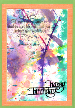 This one was mounted to a Bling orange cardstock and then onto a bright green. Rubber stamped the quote (Quietfire Design "Love where you're at") with black Versafine stamp pad. The "Happy Birthday" is one of my calligraphic Peel Off sentiments (see link at the bottom of page). |