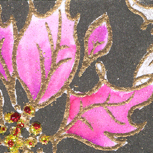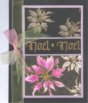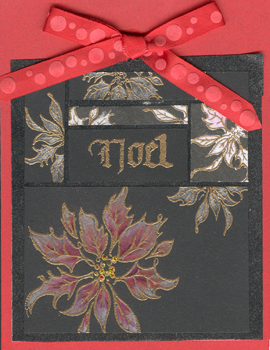 On some I rubber stamped the small and large poinsettia on black cardstock and on one I did it on white cardstock and colored the background black. Sakura Metallic gel pens and Tombow watercolor markers were used to color the flowers as well as some iridescent medium. I used Stickles yellow and dotted with the red for the florets. The card on left, the bottom section was the one done on white and background colored in black, and mounted to a lavender pearlized cardstock then onto the black main card. A gauzy variegated ribbon added. |