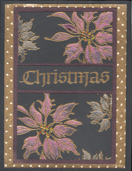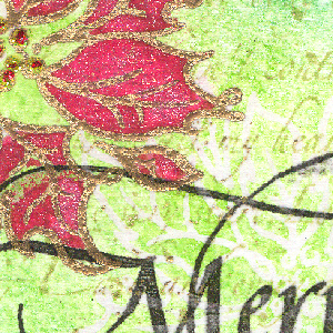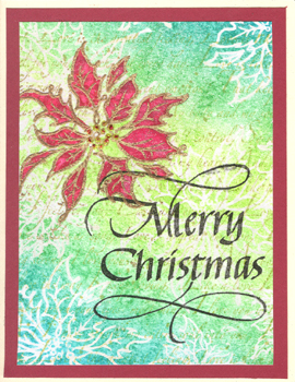 I rubber stamped both the large and smnall poinsettia onto white cardstock and clear embossed. Brayered Adirondack Rainbow dye ink onto card (Green set). Iron off the embossing onto a piece of newsprint. Rubber stamped the "Words" background stamp (Local King Rubber) using Versafine Toffee stamp pad. Heat set. Rubber stamped the large poinsettia and thermal embossed with Queen's Gold. Colored it in with Tombows and iridescent medium. Rubber stamped the word sentiment with Black Onyx Versafine and clear embossed. Adhered this to a red cardstock then onto the cream card. If you look closely at the detail pic, you can see the resist area, the script background and then the poinsettia.