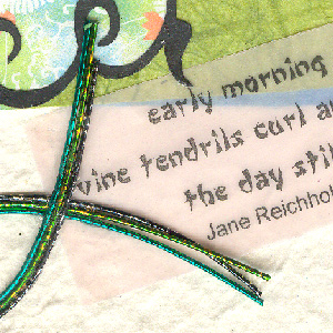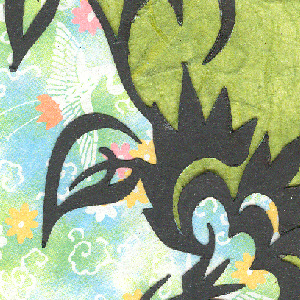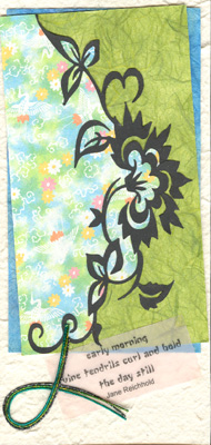 PS it was inspired by the layout on a card made by Louise Kovar who teaches Asian flare type cards at Paper Pastimes. Found this nice cutwork image, I believe through Dover Sampler, and cut it out with my Cricut, attached it to some Asian crane design paper, then cut around the design. Adhered some greenish mulberry paper to thin cardstock, and adhered my crane paper to that. Adhered a piece of bluish mulberry paper to some thin cardstock. Folded a thicker white cardstock in the height, adhered a piece of heavy textured white mulberry paper, then adhering both colored pieces to the card at a slight tilt. Found a Haiku on line that worked with my image, printed it out on some pink toned Vellum using Wonton Font. Adhered it to my card with a few dots of Glossy Accents. Then added the 3 Mizuhiki cords also with Glossy Accents. |