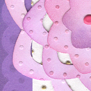 The main card is a deep purple cardstock. I made a template smaller than the card and using a Martha Stewart Scallop Dot border punch. Sponged more of the Birthstone colors around the edges, leaving a ghost image of the border design. Mounted the white heavily gold embossed dot paper. Then adhered the Dahlias and added the paper flowers with a purple floral brad. |