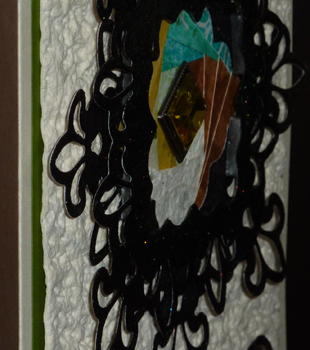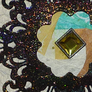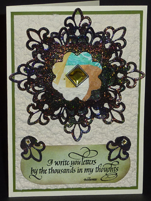 I sponged a separate piece of cardstock with Distress "Shabby Shutters" and "Peeled Paint", dried it well, then rubber stamped the quote (Quietfire Design) with the black and clear embossed, then sponged some "Walnut Stain" around the edges. From another die cut, I cut out the shapes to use as faux holding clips adding a small greenish toned rhinestone in each. I used an off white 110# cardstock for my main card, then the olive toned cardstock, then a very heavy textured mulberry type cardstock, then my assembly. Adhered the quote layer at the bottom and glued down the clips. PS after the Secret of Happiness card, I decided to color the sides of the foam tape so they weren't so glaringly white. |