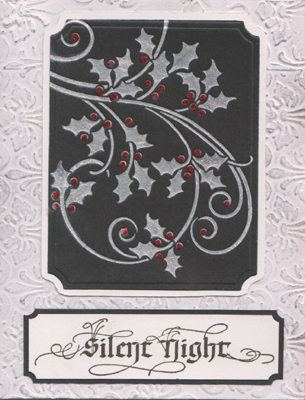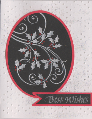 ID: LJ731 1 Oval - Best Wishes 4.25"w x 5.5"hI used the Sizzix Dots folder on a white card. Brayered on the high points and embossed with Silver Opal. Added red micro fine glitter on the berries. |