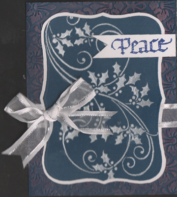 ID: LJ731 1 Rectangle Blue & W - Peace I used Kassie's Brocade embossing folder and fingered on some pink Metallic Rub Ons on a dark blue card. Adhered a white/silver ribbon and bow and the word Peace. |