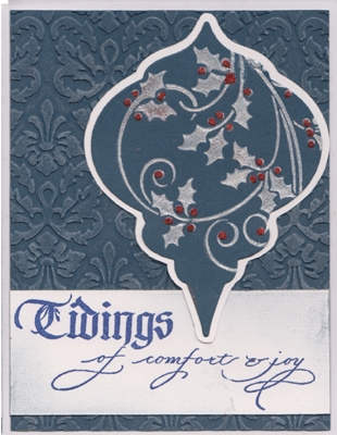 ID: LJ731 1 Xmas ornament - Tidings I used Kassie's Brocade folder on a dark blue cardstock, fingered with white pearl Metallic Rub Ons and layered onto a white card. Added red micro fine glitter on the berries. Sponged a bit of blue metallic Rub Ons on the corners of the sentiment piece. |