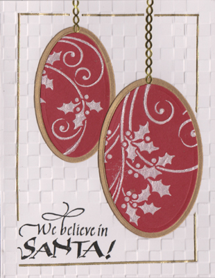ID: LJ731 2 Ovals Red & W - Santa I used the Checkerboard embossing folder from the "Everyday Bundle" set on a white card. Layered the ovals onto gold metallic. Added Peel Off gold lines as a border. |