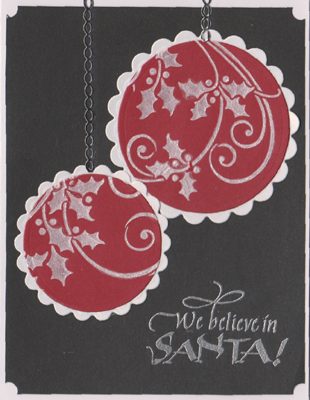 ID: LJ731 2 Scalloped Balls - Santa Layered the black inverted corner cardstock to the main white card. Added gold chain Peel offs. |