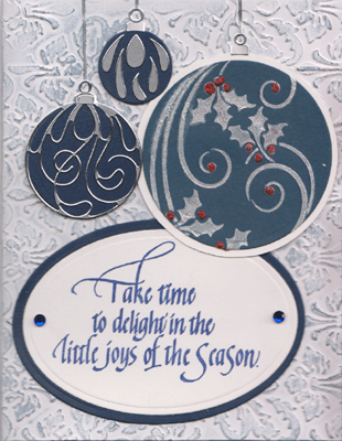 ID: LJ731 3 Balls - Take Time I used Kassie's Brocade embossing folder and fingered on some blue Metallic Rub Ons on a white card. Added red micro fine glitter on the berries. Added some silver Peel Offs positive and negative Xmas balls. Final touch added two blue rhinestones. |