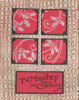 ID: LJ731 4 squares - Be Naughty I Tim's Burlap on a white card, sponged Frayed Burlap and a bit of Worn Lipstick. Layered the die cut stencil pieces to the black cardstock. |