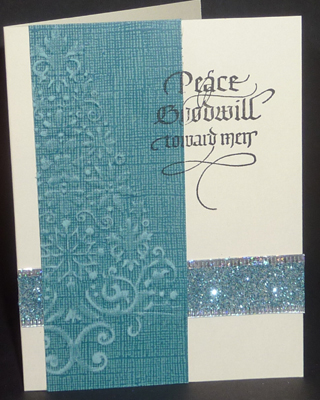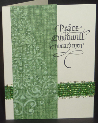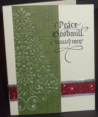 Created: November 14, 2010 I just got this lace Xmas tree embossing folder, really pretty. Also had this scrap pack of core type paper, but none were large enough for the whole tree. Sigh!! OK who needs the whole tree anyway... So I embossed the tree and then sanded the high points to get to the core color. Layered it onto a cream toned card and placed a co-ordinating ribbon underneath. Stamped the sentiment ( Quietfire Design ) with Versafine black onyx. Quick and easy card. |