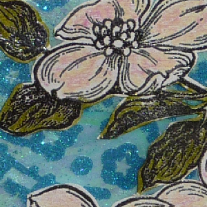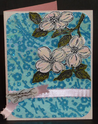 I ran the Shimmer Sheetz (blue) through the Cuttlebug with the Asian Bundle "Plum Blossom" folder. Then put Sookwang tape over the whole piece (use the sheet tape), pressed it to a piece of white cardstock, then lifted the Shimmer Sheetz at the corner and started separating the iridescent layer from the Shimmer Sheetz. The portions of the flowers that are a deeper blue is where the tape didn't remove the Shimmer Sheetz but left the adhesive behind. I then sprinkled Ritz micro fine glitter "Royal Blue" and burnished well. Trimmed my cardstock down, rounded the corners and adhered it to my main card (C'Ordinations pink/deep pink) and sanded lightly. Rubber stamped the Dogwood (Pet Aluma "Dogwood Botanical" #K-1228) with Versafine black on white cardstock and clear embossed it then lightly colored it with colored pencils (some pink and white and green on the leaves). Cut it out and adhered it to the card with pop dots. |