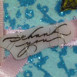 Added the silk lacy edged ribbon, tied a knot. Rubber stamped the words "Thank You" (Quietfire Design) onto white sanded Shrink Plastic with Versafine black, baked it and adhered it to my ribbon with very fine silver wire and some Glossy Accents. |