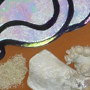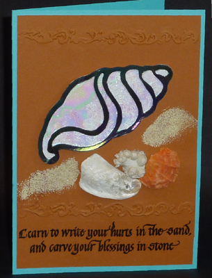 I cut out the large shell with my Cricut. First placing a piece of black Shimmer Sheetz over some double sided tape, cutting the shape, but not cutting through the tape (got to get the right depth for your blade). Then removing some of the black Shimmer Sheetz, which leaves behind the pearlescent layer. I think this product is absolutely fabulous for shells. Took a piece of terra cotta colored cardstock, (PEI sand is this color). Embossed the flourish design borders using my rubber mallet. Rubber stamped the quote (Quietfire Design) with Versafine Black Onyx and clear embossed it. Mounted this to an aqua card. Adhered my shell with adhesive pop squares. Adhered some pieces of real shells with Golden's extra heavy gel matte medium. Smeared a bit of Perfect Medium and Distress Antique Linen embossing powder. Think Tim's powder for sand is perfect, both for looks and feel.