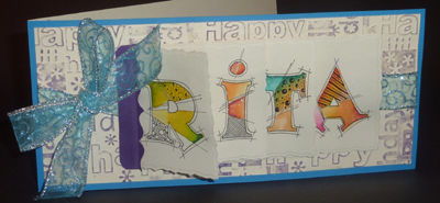 When the letters were done, I stacked them, just overlapping them slightly, then cut off the excess cardstock from the left side. Scored a line a slight 1/8" on each piece and used double sided tape to connect the layers. Created a side folded spliced cream toned card. Adhered the blue layer edge to edge. Ran another piece of cream toned cardstock with the Happy Birthday embossing folder, moving the folder over to get the length I needed. Brayered Distress Dusty Concord on the high points and clear embossed. Trimmed it down to size. Adhered my ribbon to the back. |