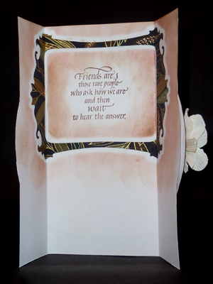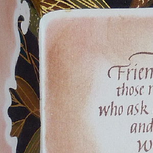 Cut some Kanban cardstock (Antique Floral Stripe Pink pkg) for either side, still leaving a small white border around. Stamped my sentiments with some Versafine stamp pad and embossed with Queen's Gold. Adhered my oval to my main white card. I left a small section of the oval free from the main card so the left hand side could squeeze under the right hand side and keep the card closed. The flower is made from off white crepe paper and a small oval punch (20 petals), pinching the bottom of the oval, while spreading the top open. Put a layer of white glue on a small circle and adhered 5 petals. continued in this manner with the other 3 layers of petals. Then put a beautiful Wedding Pearl Sticker (grant Archival - Paper Chic by Christina Re) - love these - in the center. On the inside I stamped my quote with Versafine Vintage Sepia. Used the Classic Frame die and sponged the same 2 Distress colors around the edges, Then die cut the frame from some Oriental paper. Adhered it to the card, with the previous sponging it left a nice white border. |