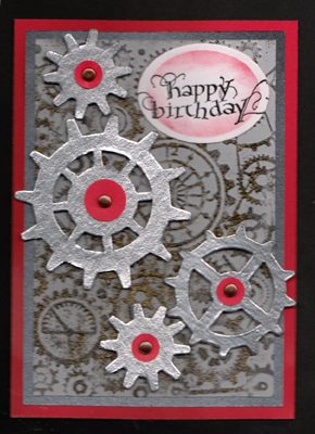 I embossed a piece of grey cardstock with the Gears folder, swiped some Versafine Smoky Grey on the high points and embossed with a mix of left over embossing powders (a greyish bronze mix). Adhered that layer to a metallic charcoal grey cardstock. I die cut the gears from chipboard, painted the edges with silver metallic acrylic paint and embossed the fronts with silver embossing powder. Added a punched out cardstock red circle and a couple on the back to make movement of the gears more easy and then attached to the card front. Adhered these layers to the red main card. Stamped my sentiment with Versafine Black Onyx, die cut with a Spellbinders Oval die, dry embossed it and sponged some Distress Worn Lipstick on the edges. |