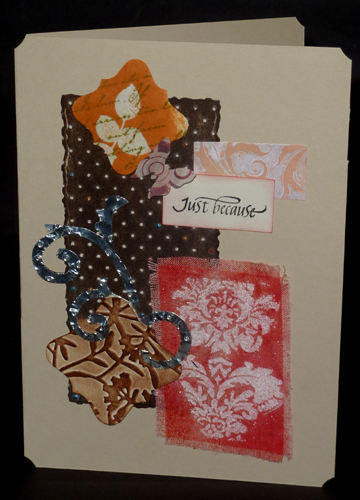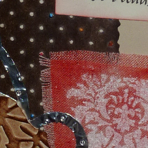 The fabric piece was one I didn't like the results as much as with the one I put on the previous card, but worked ok on this card, it uses the resist on fabric technique. You're seeing a piece of the silver metal tape but uncolored. As well as the tip of the brown square - just basic embossing sponging and high points D2P. (Sample pic 1B) Adhered all to card. Stamped the sentiment onto white cardstock with Versafine Black Onyx, punched out with rectangle punch, Edges sponged with Barn Door. The rectangle behind is a piece of Day 1 Acrylic Resist.
