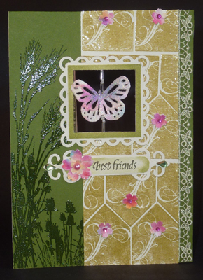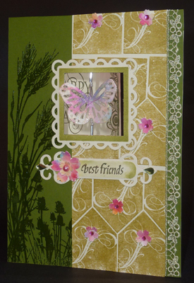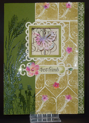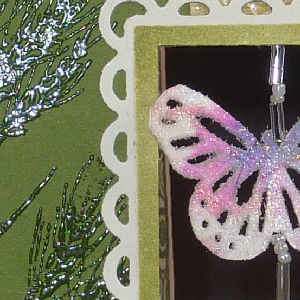 I started with an olive green cardstock, stamped various elements from the Inkadinkado "Meadow" set #60-30496 using Versafine Spanish Moss and clear embossing. I then used a cream toned cardstock with the flourish design repeatedly stamped with the Moss and clear embossed, trimmed to size. I lay a piece of double sided tape down first on the olive cardstock to adhere my decorative lace piece, then adhered the flourish piece. I die cut the Lacy Square (Spellbinders), dry embossed it then sponged Distress Shabby Shutters. Adhered it to the previous layers. I then cut out a window through all 3 layers. Punched out the butterfly from some tissue decorated cardstock using Martha Stewart Large Monarch punch. Inked it with Perfect Medium and embossed with Kaleidocolor. Lay a piece of gold metallic thread between the 2 butterflies and glued them together. Added some glass seed beads and attached it to the back of the window opening with tape. Adhered all this to the front of my cream toned card. Used the cut out shape to cut the opening in the cream cardstock, careful not to cut my thread. |