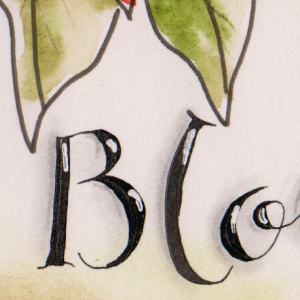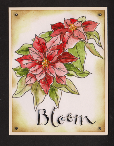 When dry, sponged Vintage Photo around the edges. Wrote in my word with a Nikko G nib and Sumi ink, exaggerating the weight of the thicks. Added a pencil stroke and blended with a stump to add shadow, then touched them with a White Remisce gel pen. Also added little dots at each corner with the bullet tip of the Zig Writer - adding shadow and highlight. Layered this onto a cream card. Added some Distress Stickles Antique Linen with my finger, just to give it a bit of pizzazz. Added some yellow Liquid Pearls for the flower heads. |