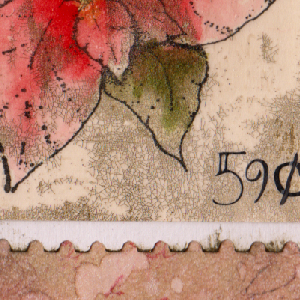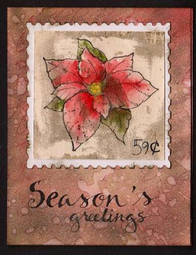 On cream toned cardstock, stamped the poinsettia (Stacy Stamps #1047AA) with Versafine Black Onyx. I used Daniel Smith's Poinsettia Triad (Pyrrol red, Serpentine Genuine & Mayon Yellow). Dried thoroughly then put a nice layer of Distress Rock Candy, dried and sponged with Walnut Stain, wiped of excess with damp tissue. Trimmed it to fit my postage which I edged with the brown. Main card is cream toned, sponged Walnut Stain and Aged Mahogany, dribbled water and dried. Adhered my postage stamp. Added the 59¢ using rub-ons. Lettering done with Sumi ink and a pointed pen. It bled a bit - c'est la vie. |