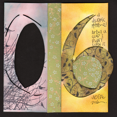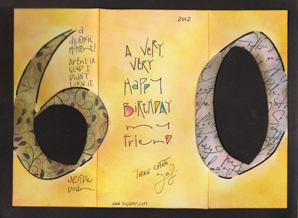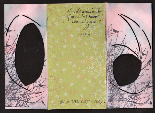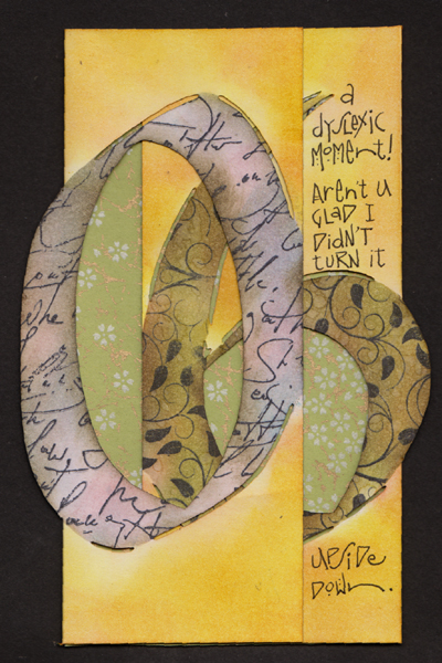 I calligraphed my numbers, scanned them, manipulated them and then cut the cut outs for the numbers with my electronic cutter. This way I didn't have to worry if I made a mistake, could always cut another one very easily. I masked the negative spaces, and stamped the numbers with background stamps (Impression Obsession CAC "Script" & "Vines") using Archival black. Colored the numbers with Distress Milled Lavender with Broken China, sponging Walnut Stain around the edges for the "0"; and Scattered Straw, Peeled Paint, Shabby Shutters, Dried Marigold for the "6" also edging with the Walnut. Masked the numbers and sponged the backgrounds with Distress Mustard Seed & Dried Marigold for the yellows, and Milled Lavender with Broken China for the pinky tones. Wrote in my text on the front with a Micron black pen. Words: a dyslexic moment! Aren't you glad I didn't turn it upside down." I figured she could use being 06 years young for a few more moments...