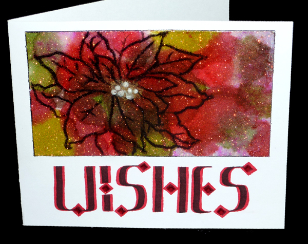 I dribbled Adirondack Alcohol inks, various greens & reds, and some blender solution, let dry and stamped the poinsettia (Flourishes set#37) using Versafine Black Onyx. Went over the lines with a black Identi pen. Added white dots with Rangers Enamel Accents, dried then applied Perfect Medium and clear embossed with UTEE. Edged the piece with the Identi pen. Adhered it to a white side folded card and wrote in my word "Wishes" with a thick broad edged red marker, then went over it with a narrower black marker. Added red square rhinestones.