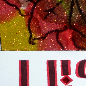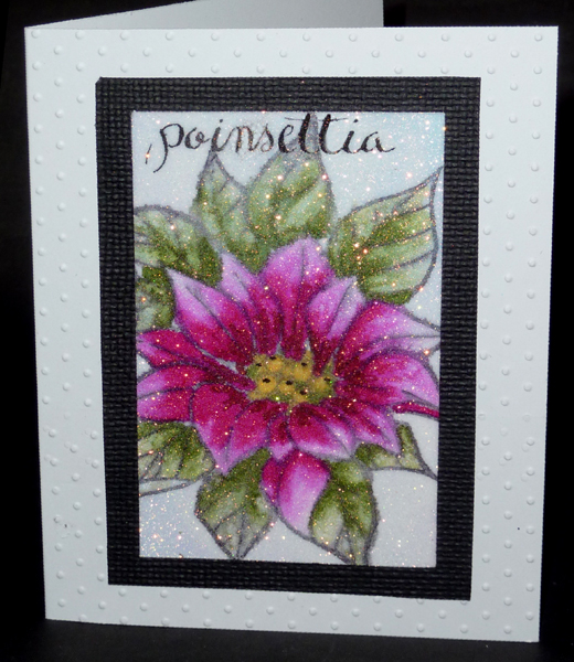 I stamped the poinsettia (Stubby Stampers "Giant Poinsettia") with Distress Black Soot and colored with the Spectrum Noir alcohol inks. Embossed my card front with a Cuttlebug "Swiss Dots" embossing folder, then adhered my glitter piece to a black textured cardstock then to my card front. Don't ask... what a fiasco with the word I wrote and fixed up in my photo editing program. Sheesh... First I wrote part of my word missing the "n" so had the word "poise" when I realized it. So scratch, Scratch, to remove the ink etc and over wrote the letters correctly or so I thought... Took my pics of the card and saving the file and realized I forgot to put the 2nd "t" - sheesh again, so in the photo editing, I just copied and pasted my letters shifting them over to fit the extra "t". Now to figure out how to correct it in real life... Wrote the word using a pointed pen and Sumi ink.