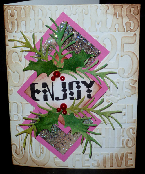Since not everyone has Micro Fine glitter, thought I'd try it with Ultra Fine glitter instead. Will work as far as coloring goes, but not great for a stamped image. So obliterated the image I stamped and added more inks. Cut the piece into squares and layered onto bright pink squares. Embossed the card front with a Sizzix "Holiday Orint" embossing folder. Sponged some Distress Gathered Twigs around the edges and adhered my two glitter squares - offset. Wrote my word "Enjoy" with the black broad edged pen, cut into a square, sponged some red and brown around edges and adhered to the pink square then onto card front with 3D foam tape. Die cut the pine bough sprigs (Cheery Lynn) from some green decorated paper from my stash. Die cut the holly leaf (Sizzix Tim's Movers & Shapers mini "Pine Tree" set). Added a bit more green to those leaves and adhered both to card front adding two sizes of red half pearls.