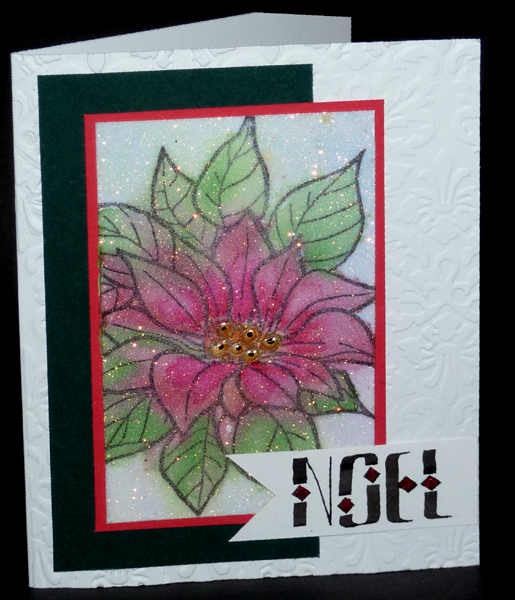 I stamped the poinsettia (Stubby Stampers "Giant Poinsettia") with Versafine Black Onyx and colored with the Ecoline inks. The ink spreads very quickly, so only put a minute amount on the tip of your brush and have a heat gun handy to stop the migration. You can use a damp brush to move color in areas you don't want color and blot with a dry paper towel, much like lifting color with watercolors. Used Liquid Pearls "Buttercup" on the centers, let dry and dotted them with the Identi pen. Adhered to a red and deep green cardstock. Embossed my card front with a Cuttlebug "Kassie's Brocade" embossing folder, then adhered my various elements. Wrote the word "Noel" on a separate piece of white cardstock with the black broad edged marker. Added some quickie glue to the diamond centers and then red Ritz micro fine glitter. Cut the end into points and adhered to card. |