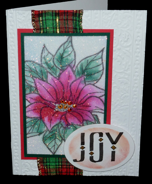 I stamped the poinsettia (Stubby Stampers "Giant Poinsettia") with Versafine Black Onyx and colored with the Tombows watercolor pens. NOTE: The ink does not spread as much as with the Ecoline inks. Used Liquid Pearls "Buttercup" on the centers, let dry and dotted them with the Identi pen. Adhered to a deep green and red cardstock with a tartan ribbon between the layers. Embossed my card front with a Cuttlebug "Holly Ribbons" embossing folder, then adhered my various elements. Wrote the word "Joy" on a separate piece of white cardstock with the black broad edged marker. Added some quickie glue to the diamond centers and then gold Ritz micro fine glitter. Die cut with a fat Spellbinders oval die, sponged some Red around the edges and adhered with 3D foam tape.
