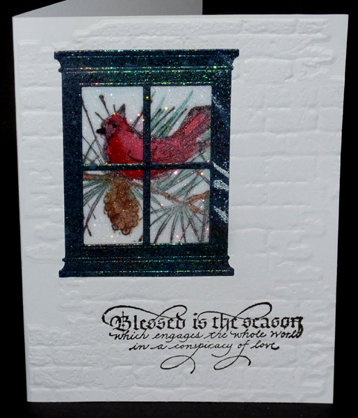 I had die cut a bunch of Memory Box Madison Windows small a while back and these two cards use those cut outs. This one has an iridescent/holographic embossing powder and has tones of blue and greens in it depending how it hits the light. The one below was a stamped embossed image and then sponged with Distress, I remember making it a couple years ago... The cardinal images are cut out of one stamped image (Heartfelt Creations "Cardinal Pine Bough border set"), stamped with the Versafine and colored with real watercolors (Daniel Smith) and a damp waterbrush. The background is embossed with Sizzix Tim's Distressed Brickwork embossing folder.