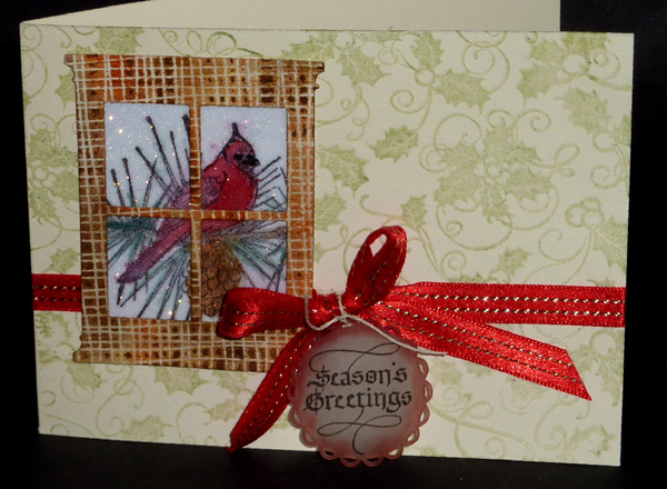 Window & cardinal explained above. Card front stamped with Impression Obsession CAC Holly using Distress Bundles Sage and clear embossing on cream toned cardstock Ribbon and bow adhered, then window. Stamped the sentiment onto shrink plastic, die cut with Spellbinders Lacey Circles, sponged with Distress red and shrunk, then tied to bow with twine.