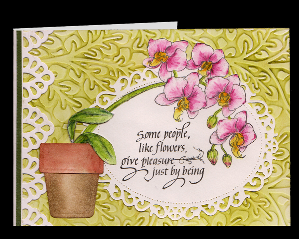 Adhered the floral oval, then the flower pot, adding hand cut leaves from the other orchid in the set and adding a length of stem. Quote stamped with the black.