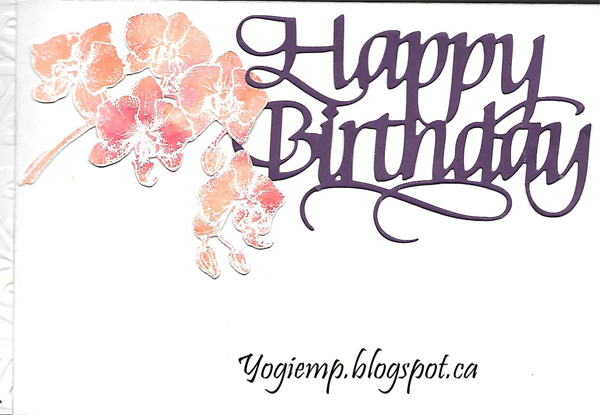 Inside: Used my electronic cutter to cut the outline of the orchid stamp from Distress Oxide decorated cardstock. Inked with Distress Picket Fence and embossed with white embossing powder. Die cut the "Happy Birthday" (Elizabeth Craft Designs die also available on Quietfire Design) from a purple scrapbook cardstock.
